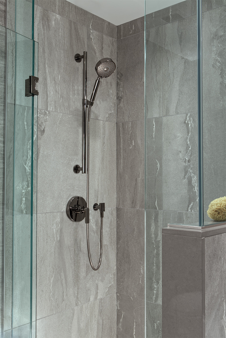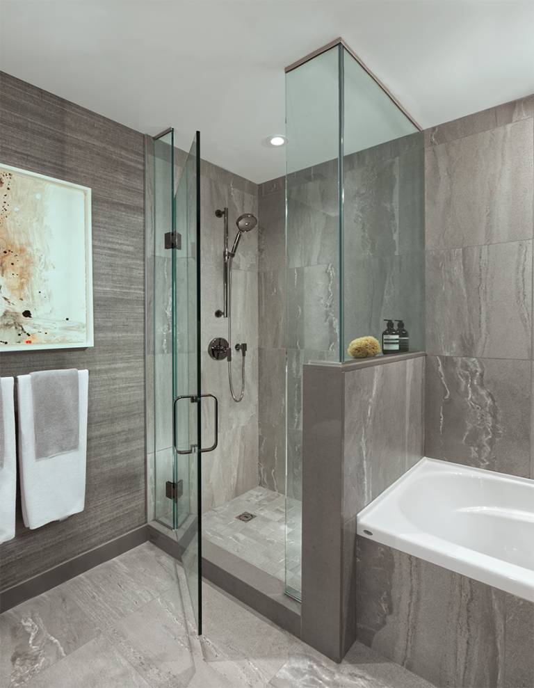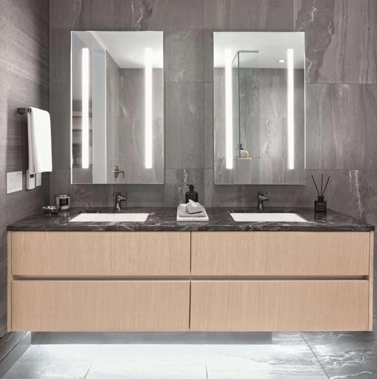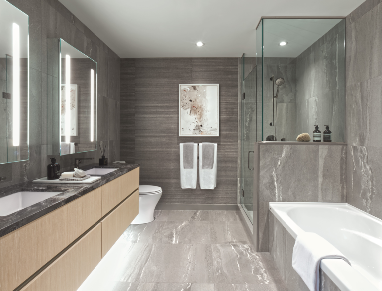 Whether starting your day or unwinding at the end, the bathroom is an exquisite sanctuary with a frameless glass shower or deep soaker tub equipped with Kohler accessories. The marble countertop sits atop the softly underlit double vanity, imparting an atmosphere of requiescence and reset.
